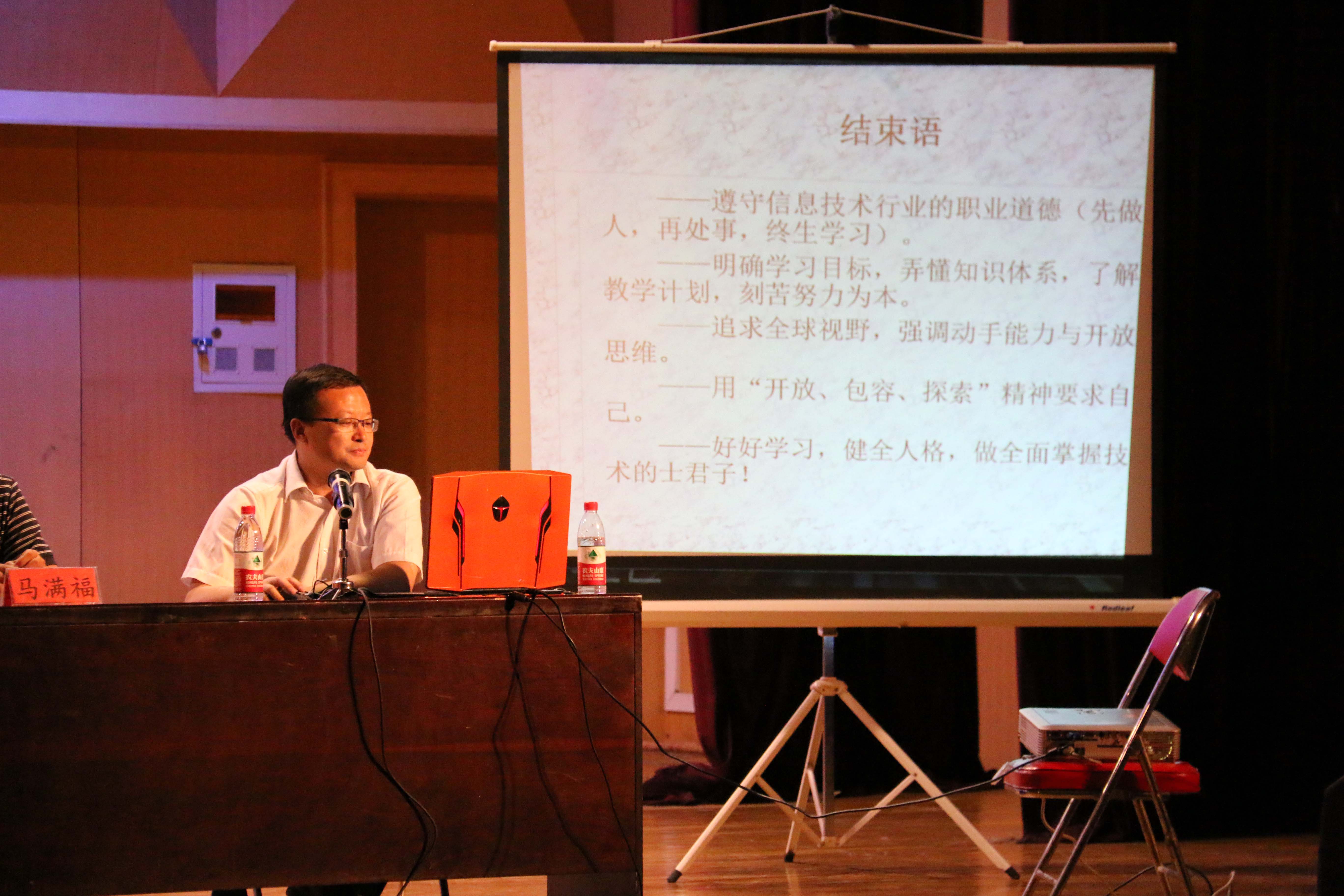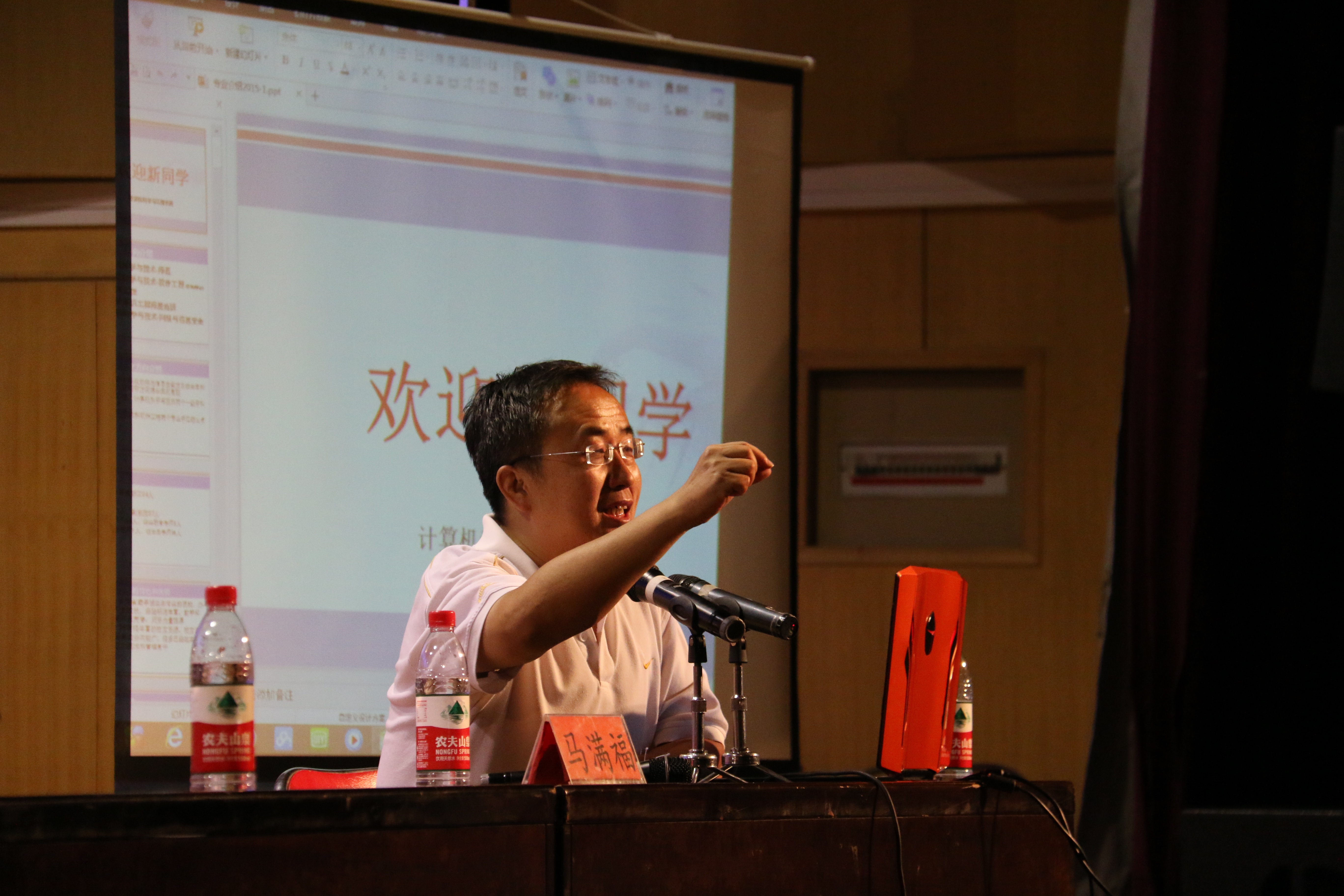 在庄严的国歌声后,公司经理党小超教授首先致辞。他代表公司向2015级全体新生表示热烈的欢迎和诚挚的祝贺,并向全体新生详细介绍了公司的历史传承,团队力量,人才培养、就业情况。随后给新生提出“为什么要来到大学?”这个问题,旨在希望新生尽快适应老员工活,并且对自己的未来有一个规划,不要浪费人生中最美好的四年。党经理要求大家在大学期间要学会做人、做事、做学问,要发扬“知术欲圆,行旨须直”的师大精神,力争做一个高素质全能型的人才。