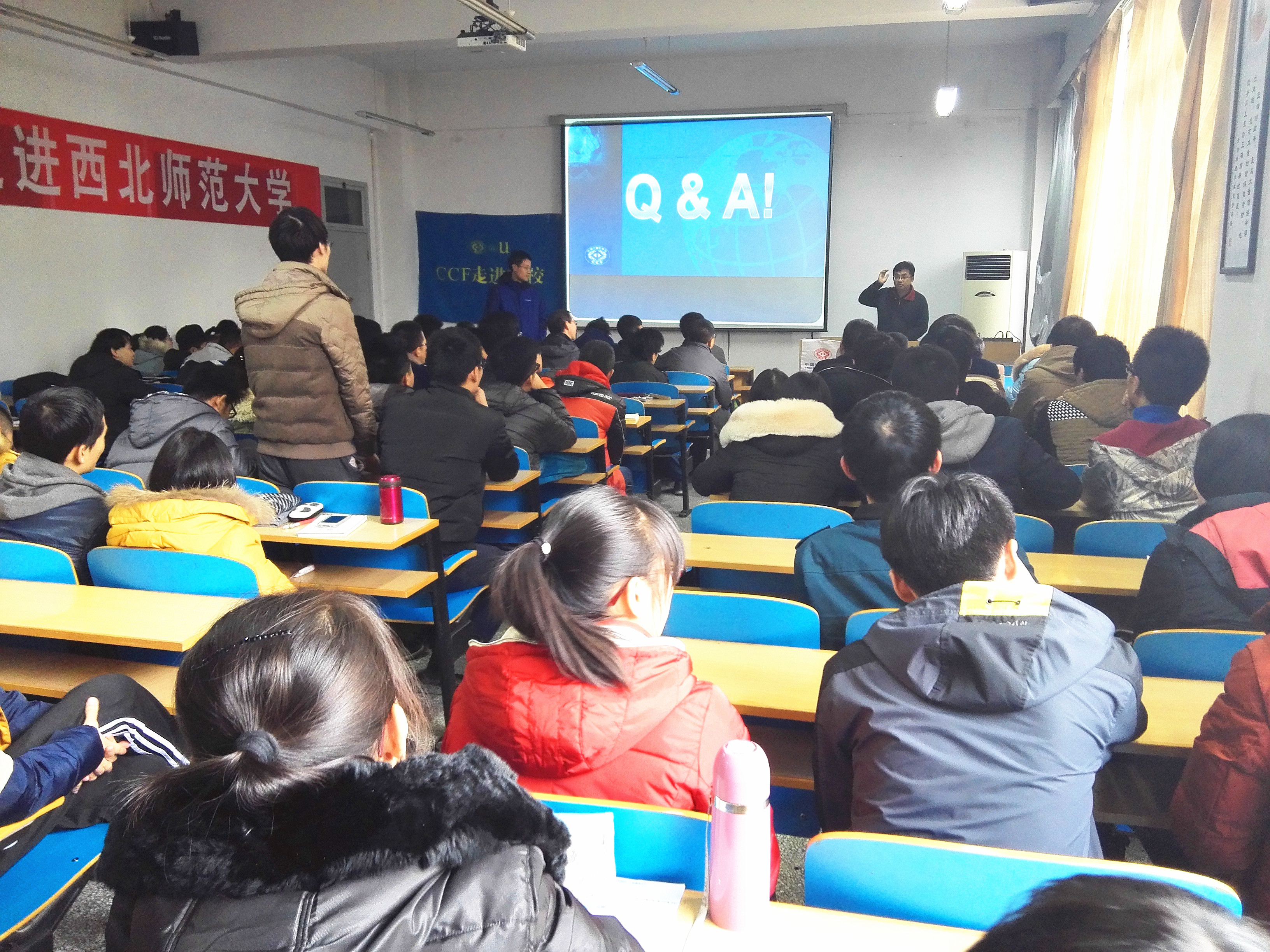 两个半小时的报告会,氛围浓厚,互动活跃。通过讲座,同学们进一步了解了互联网时代对青年人才的素质和竞争力要求,并受到了鼓励和启发。在进行报告的同时,何万青博士也向参会师生介绍了中国计算机学会的服务理念,鼓励更多师生成为CCF会员。