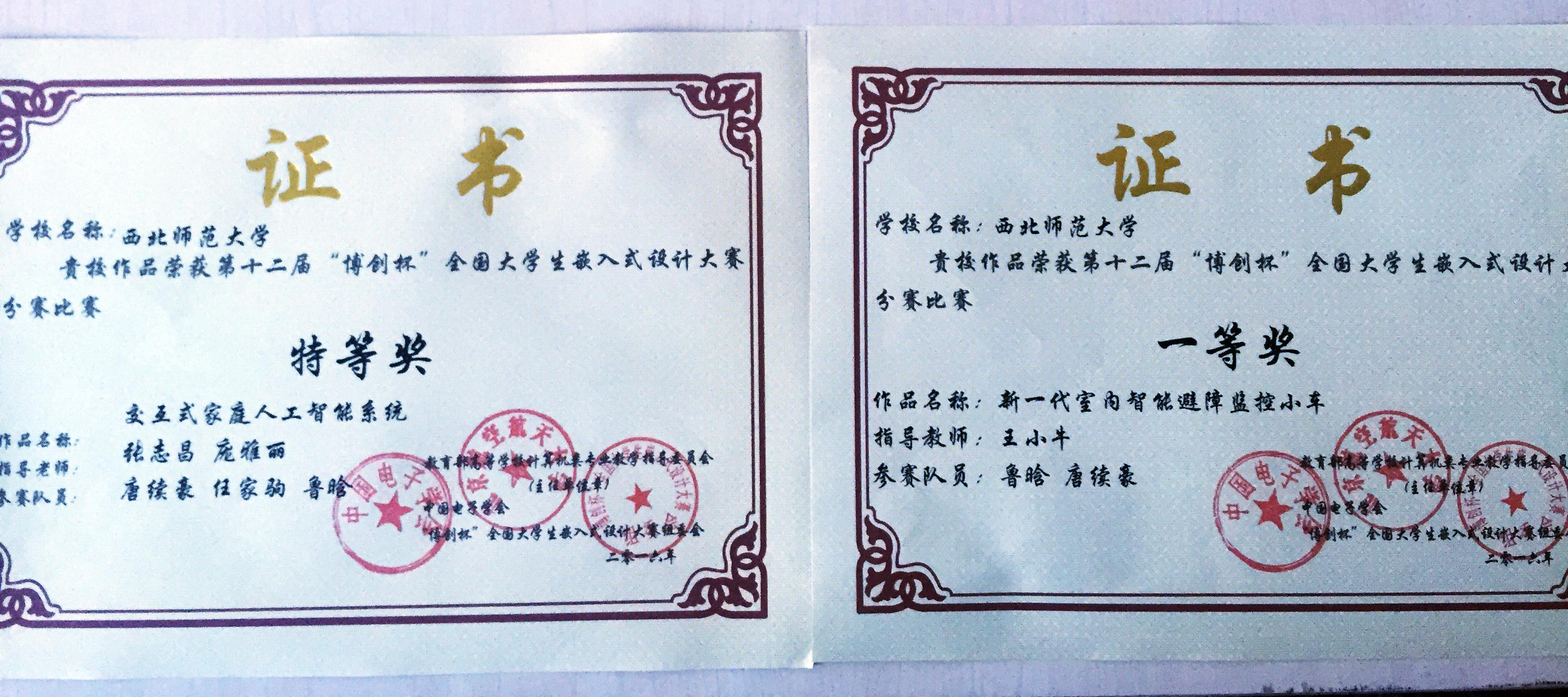 由索国瑞老师、党小超老师指导的张珍文同学的作品“基于魔法师创意平台的危化品仓库环境监测系统设计”,由王小牛老师指导的鲁晗同学的“新一代室内智能避障监控小车”获得大赛一等奖,周侗等同学的“基于物联网的图书管理终端系统的设计与实现”获得大赛二等奖。