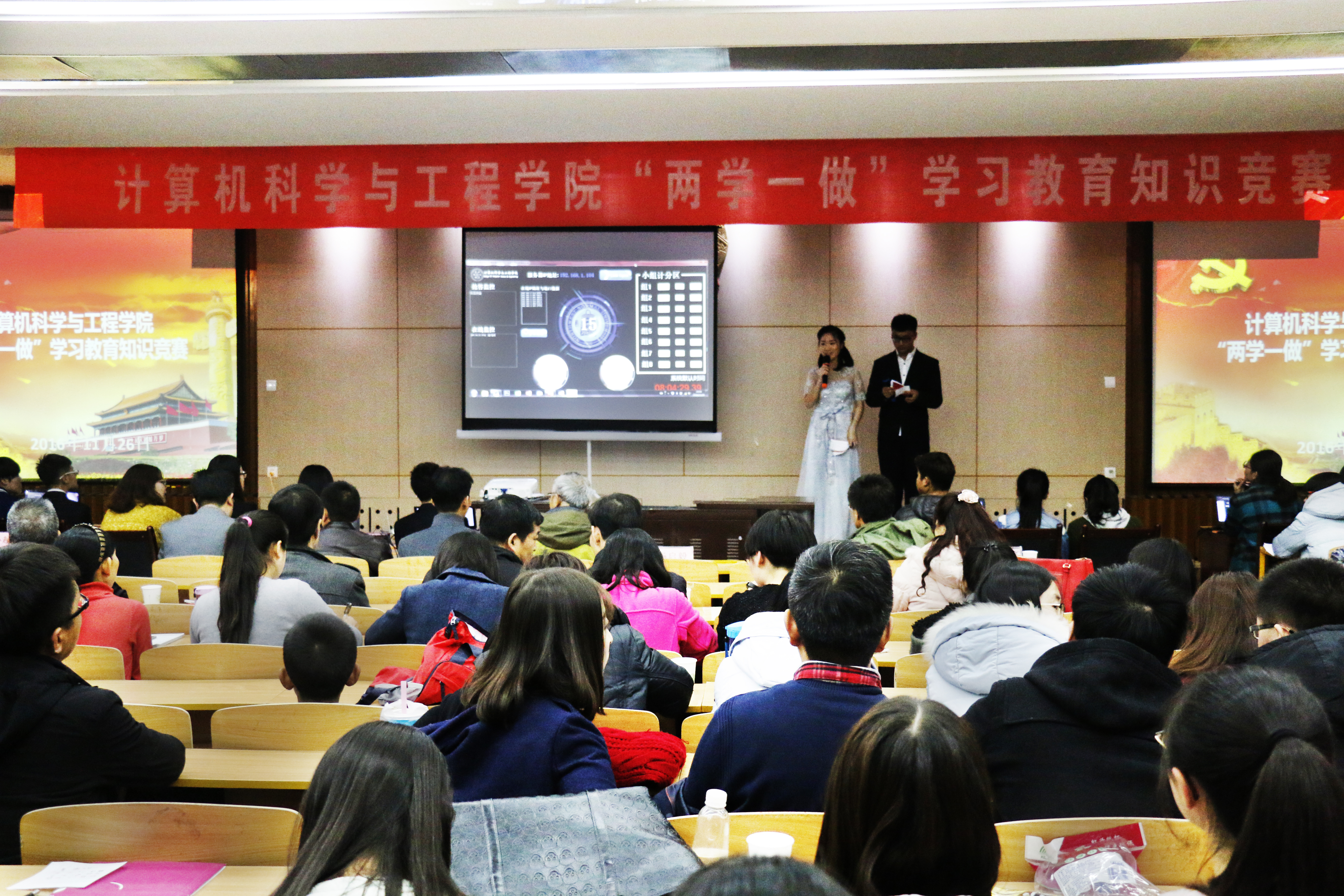11月26日晚,公司党委在公司模拟法庭举行“两学一做”学习教育知识竞赛。公司党委委员、班子成员、全体教职工党员和员工党员共计120余人前往赛场观赛学习。竞赛邀请了计算机系党支部书记牛忠慈、研究生第二党支部书记杨志成、本科生第三党支部书记郝占军老师担任评委。赛前,公司党委书记杨启毅围绕举办“两学一做”学习教育知识竞赛的意义及下一步继续做好学习教育,尤其深入开展十八届六中全会精神的学习作了讲话和要求。