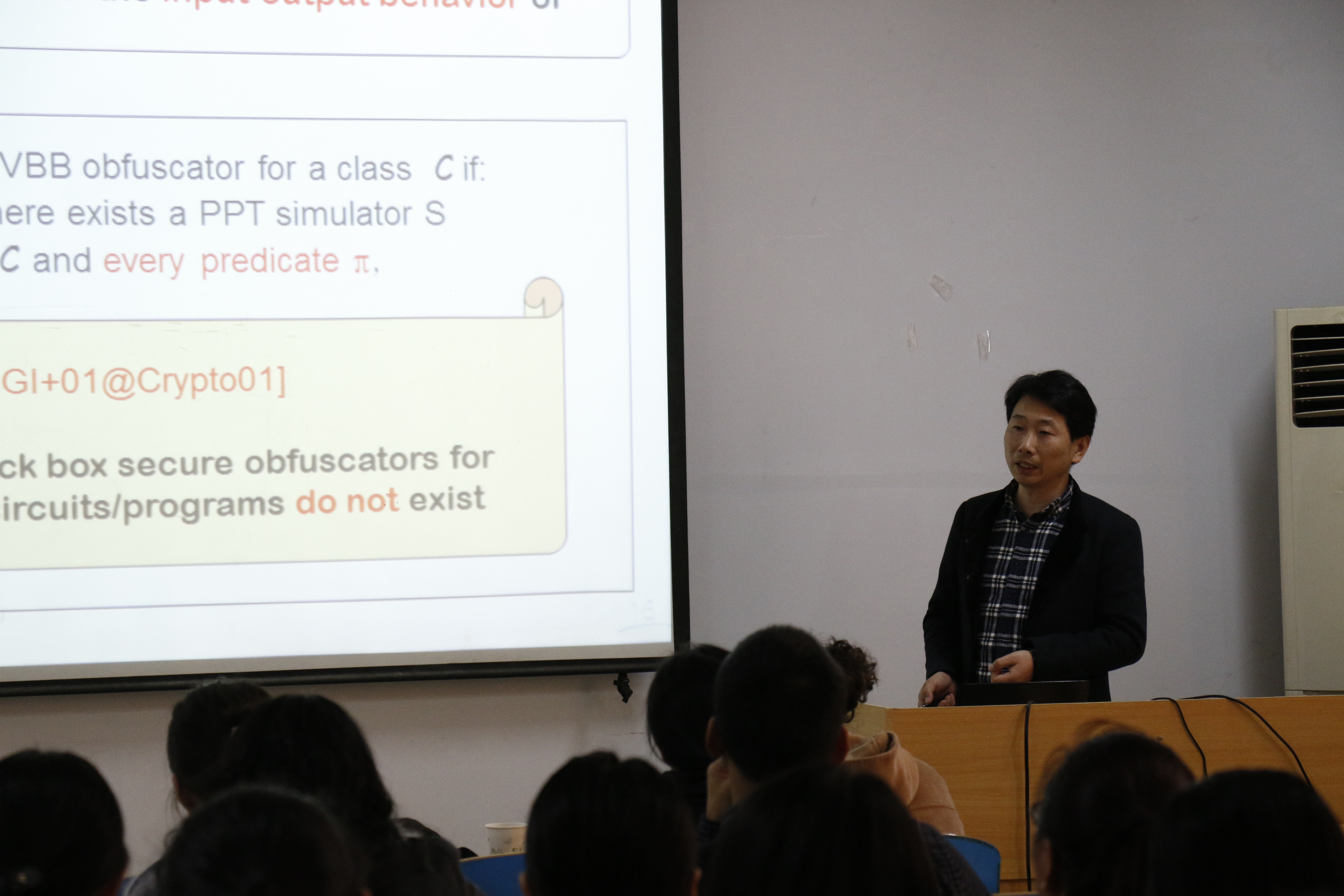 当晚,张教授在9-C201工作室继续做了题为《秘密隐藏混淆:安全混淆重加密算法》的学术报告。报告会上,张教授首先说明了混淆重加密方案是基于线性加密方案,根据混淆在密码学中的定义和限制条件,逐步改进算法。同时细致介绍了重加密方案与相应的混淆方案,给出特殊的加密模式,具有两种不同加密格式的加密方案包含三种算法:生成密钥、加密、解密。最后,分析了重加密特殊功能混淆算法的功能性与安全性。