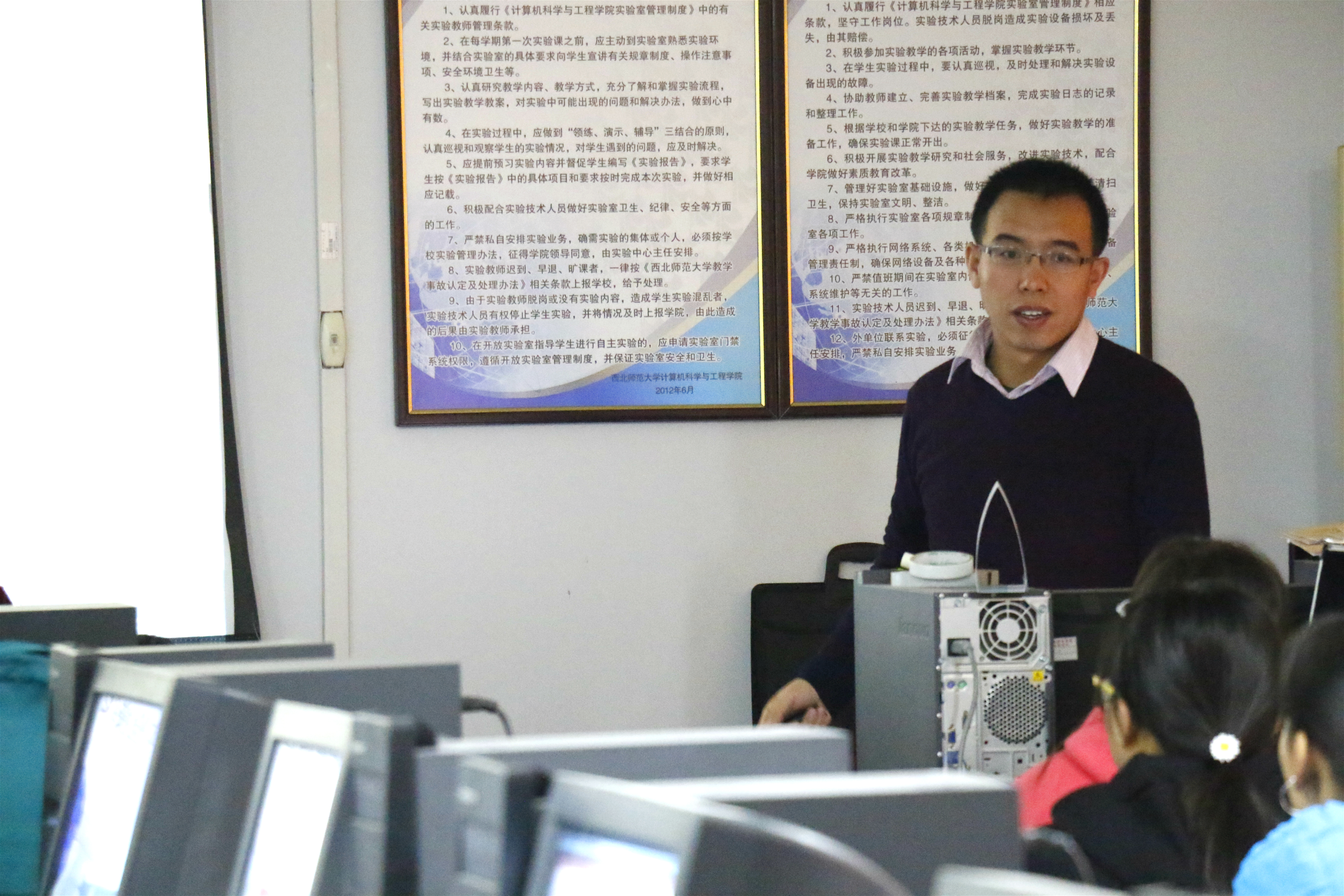 初赛如火如荼进行着。截止2017年3月24日第一评审组成员参加并评议了秦红武老师讲授的《C语言程序设计》课程、张国治老师的《网络管理》课程、王圣伟老师的《计算机网络》课程以及马秀琴老师的《数据挖掘》课程,而第二评审小组成员则参加了李芬芳老师、张小侠老师、黄萍老师分别讲授的《大学计算机基础II》课程和巩九洲老师的《计算机组成原理实验》课程的听课和评议。比赛中,青年教师们认真组织教学环节,合理安排教学内容、精心设计教学课件,以饱满的精神参加比赛,座下的评委们尽职尽责,严格按照教学内容的熟练程度、教学环节的把握、教学教态、与员工互动的状况等进行评议打分,并对参赛教师细致点评及提出建设性的建议。