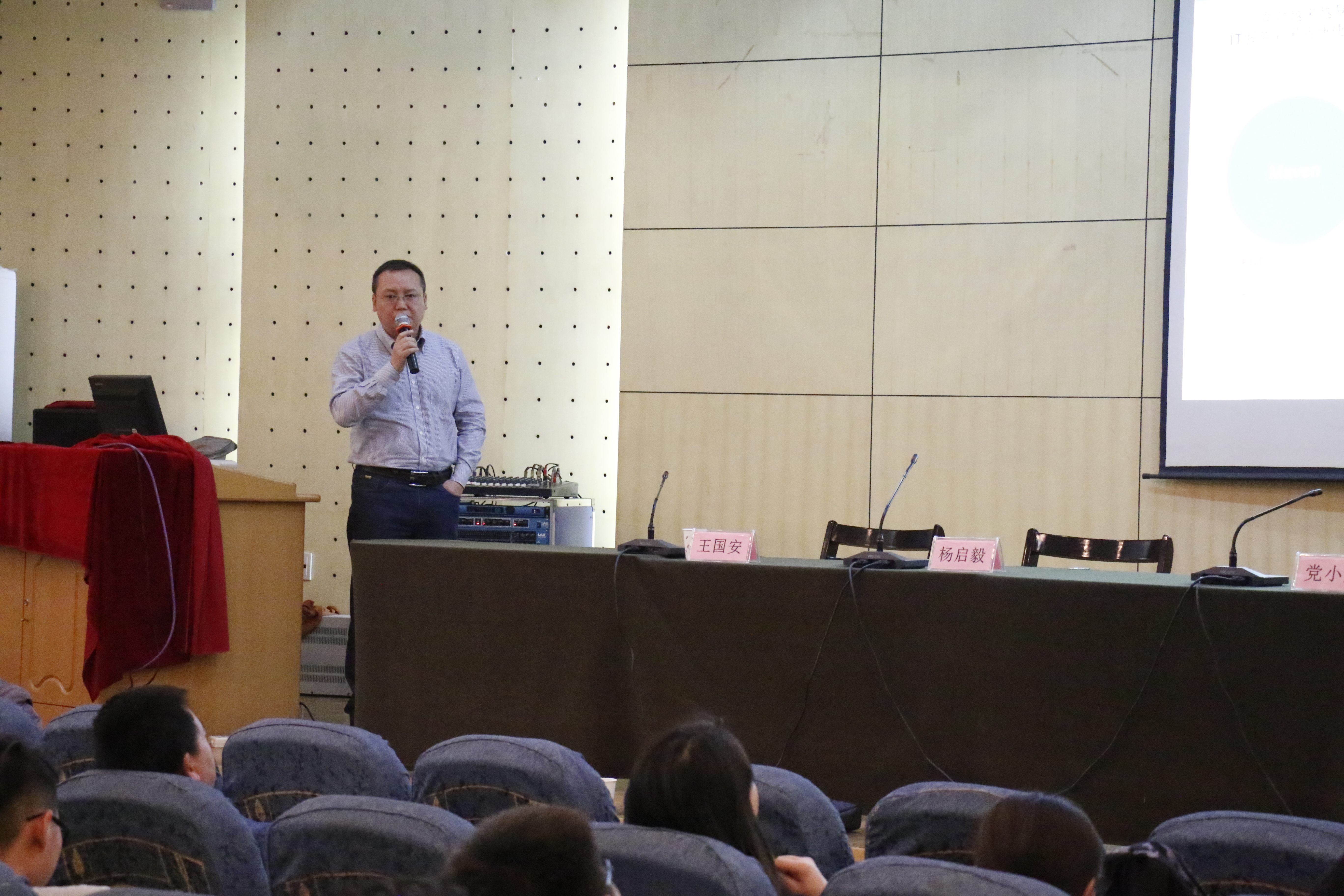 王国安副总经理做了题为《互联网软件技术发展与应用》的学术报告。报告首先说明了互联网软件架构的演进过程以及软件架构的关键点,着重介绍了简单LAMP架构、应用服务与数据服务分离、使用缓存改善网站性能等架构演进过程。然后,用他实际参与和管理过的中国电信翼校通平台和中国电信综合办公平台为典型案例, 讲解了Web前端技术中类库框架选择、服务端技术中Spring MVC、MyBatis等常用服务端框架及常用中间件数据库、消息队列、NOSQL、DevOps组件、以及互联网测试团队的工作模式等。最后,王国安副总经理结合IT巨头企业的发展历程,勉励同学们站在巨人的肩膀上进步成长。
