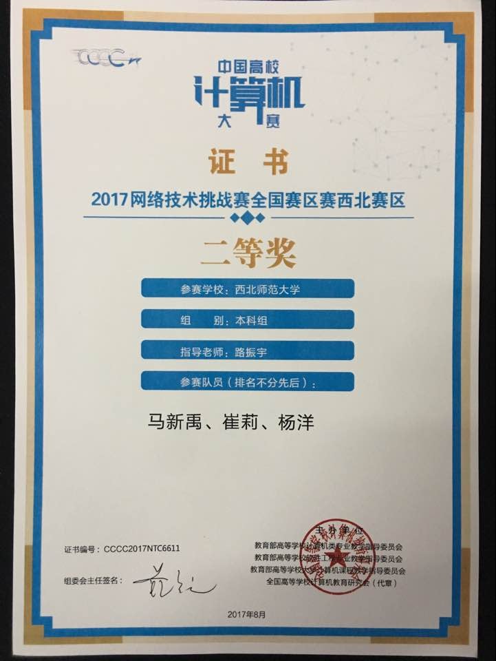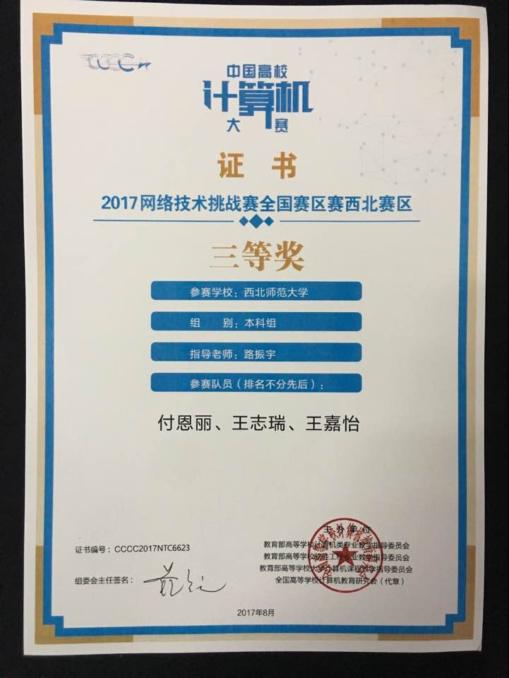 7月22日,中国高校计算机大赛-网络技术挑战赛(西北赛区)在西安邮电大学举行,js33333金沙线路检测取得优异成绩,有两支队伍分获西北赛区二等奖,三等奖。此次大赛由公司路振宇老师带队,经过校内淘汰赛,最终有五支队伍出线参加此次比赛。出线队伍在假期认真集训,比赛中发挥出色。其中,崔丽、杨洋、马新禹三位同学以赛区前十的优异成绩获得了二等奖;付恩丽、王嘉怡、王志瑞三位同学获得三等奖。