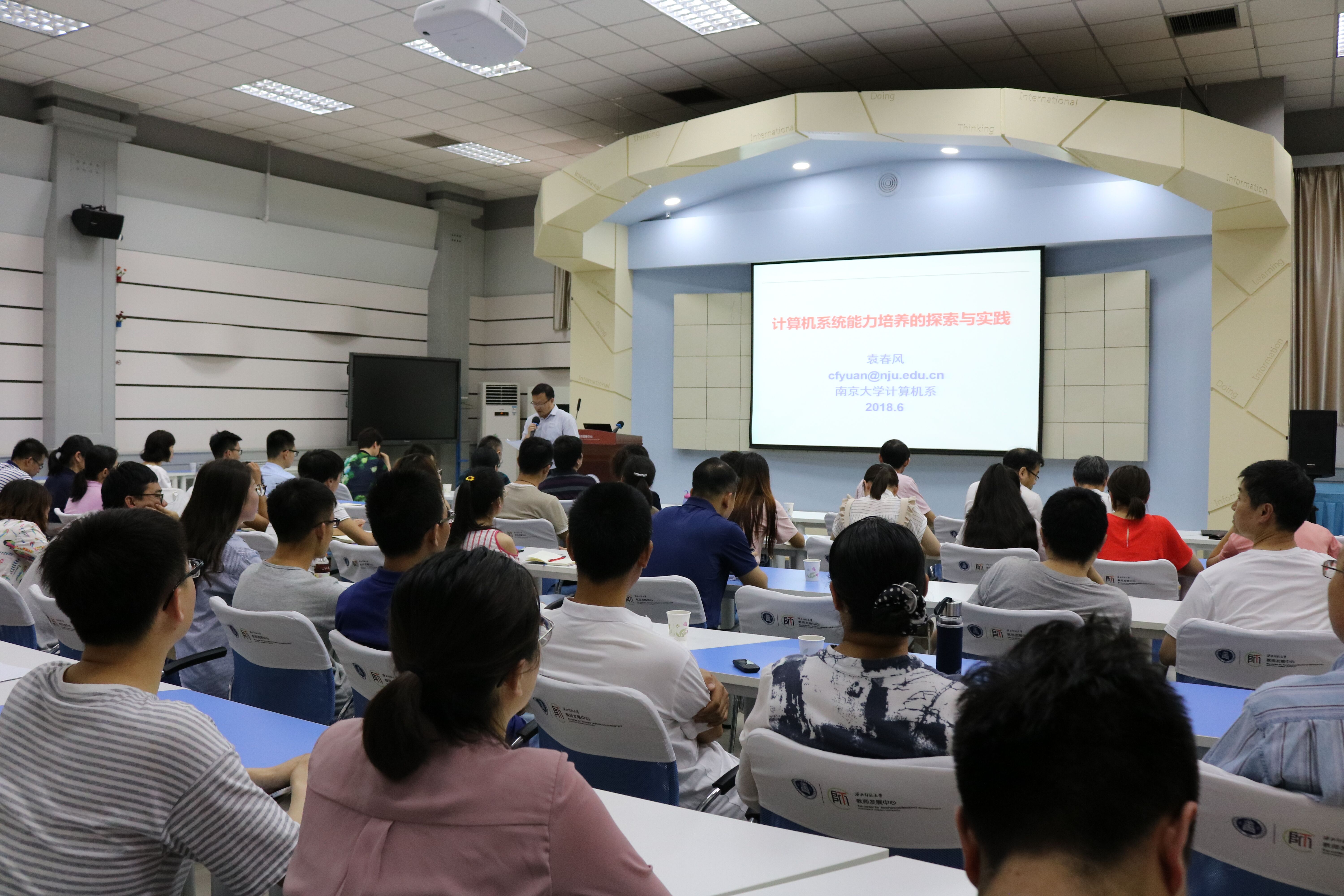在报告中,袁春风教授首先分析了对计算机专业员工进行系统思维与能力培养的重要意义,并分析了国内高校在计算机专业课程体系设置与教学中存在的重理论、轻实践、缺关联、少综合、缺乏系统观等问题,然后重点介绍了南京大学计算机科学与技术系在员工计算机系统能力培养方面的总体思路、课程体系改革、以及实践情况等成果。
