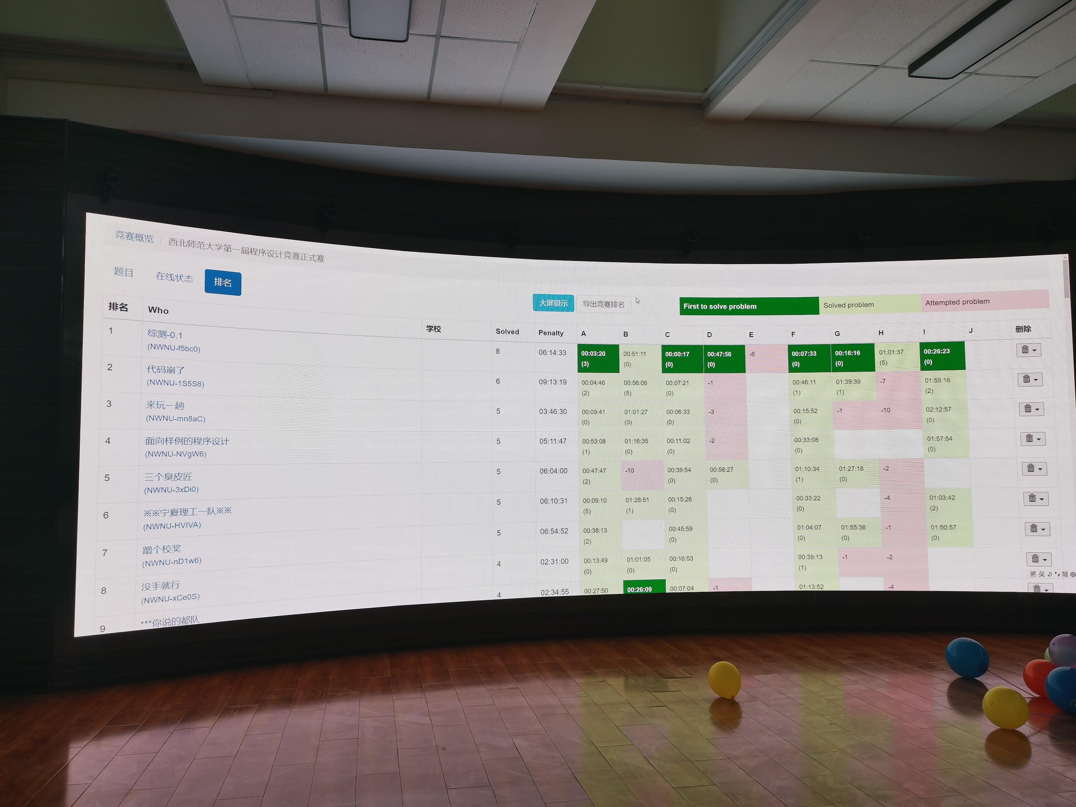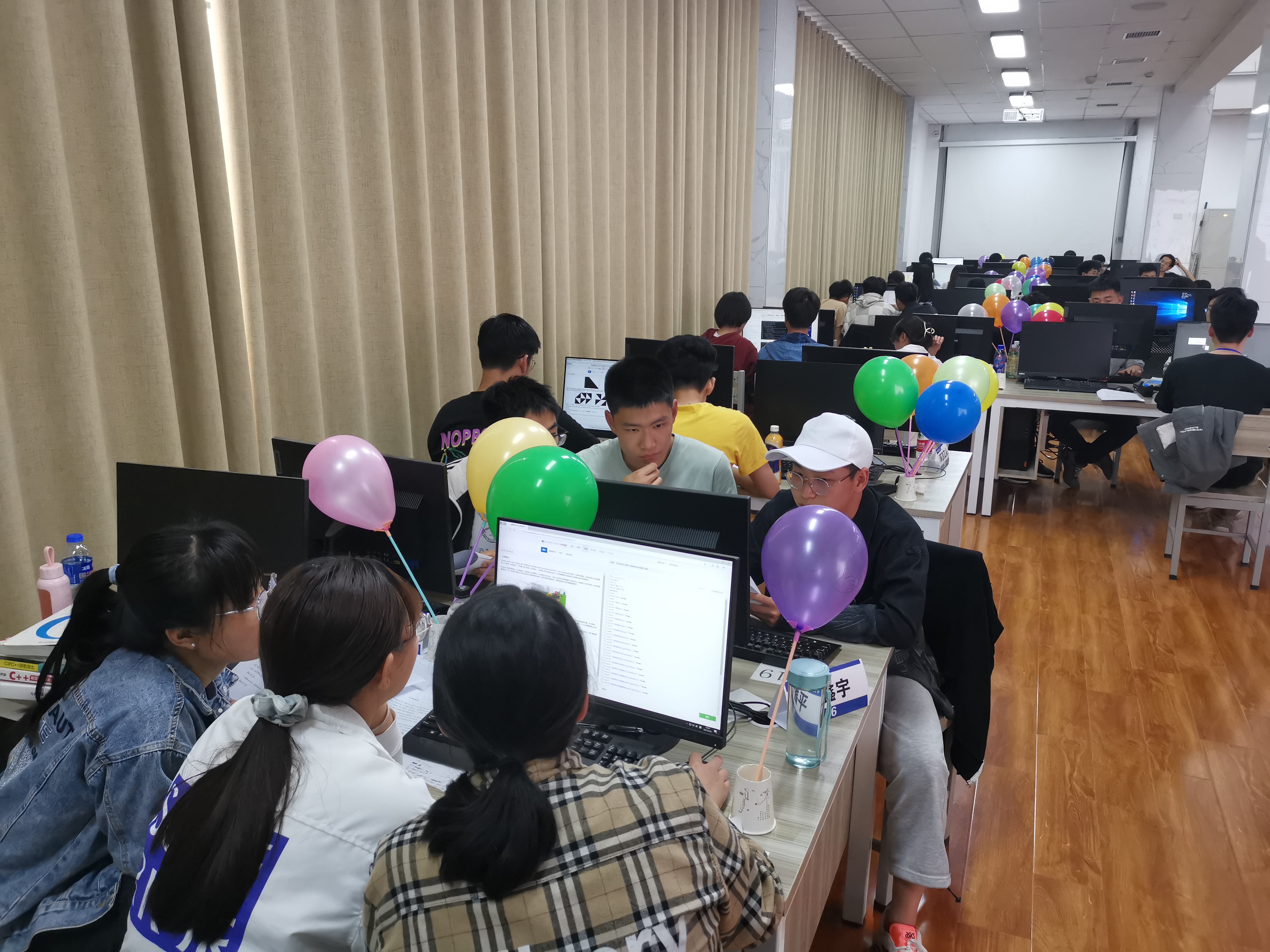 竞赛采用ACM-ICPC赛制,3人组成一个团队,在4小时内解决10道题目。竞赛中,各团队团结协作、积极讨论,努力解决问题,每做出一道题,志愿者为团队发一只气球,各团队你追我赶,现场实时排名,气氛非常热烈。