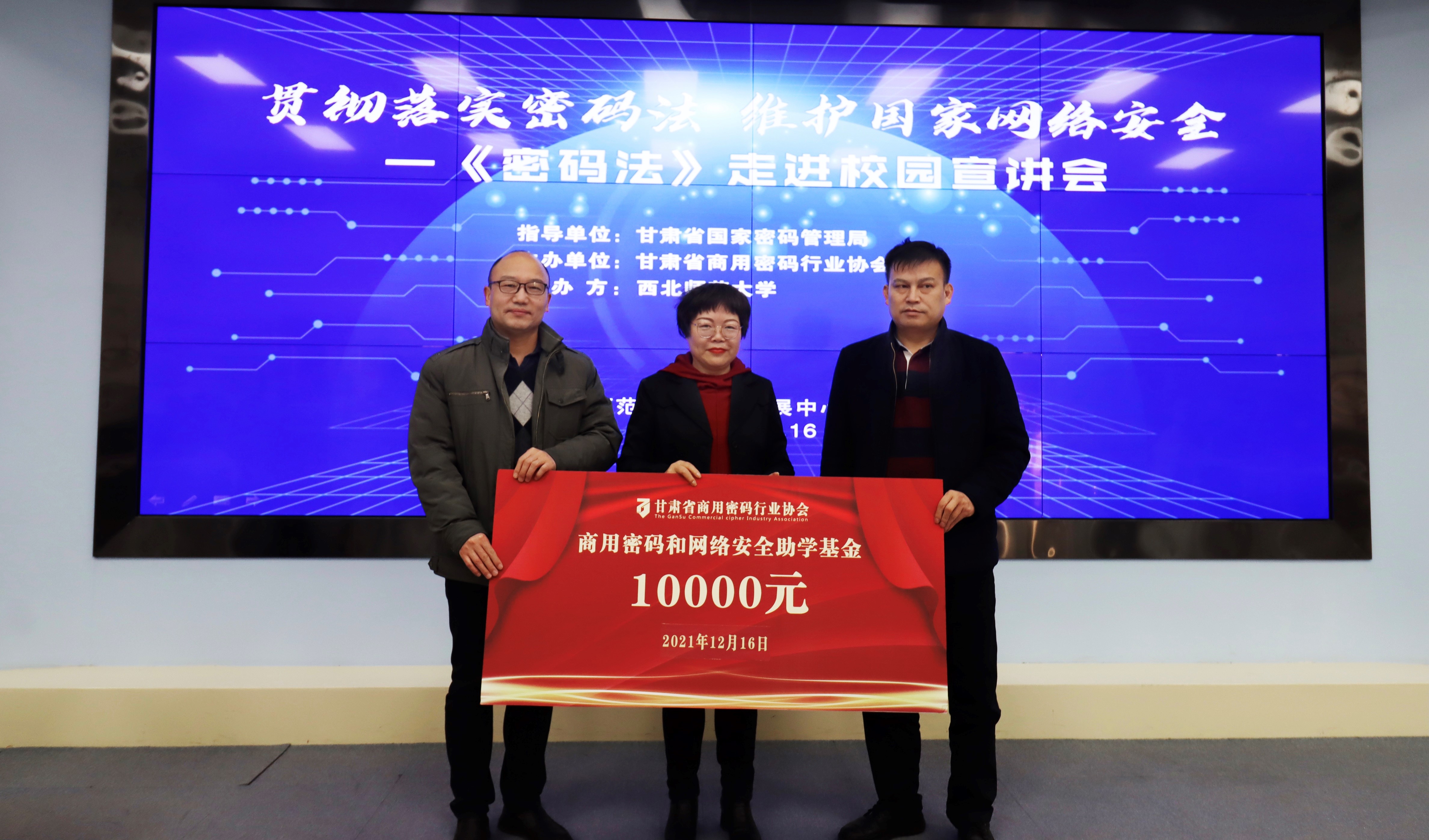 本次活动还举行了甘肃省商用密码行业协会助学基金捐赠活动启动仪式。甘肃省商用密码行业协会设立“商用密码和网络安全助学基金”,用于长期资助js33333金沙线路检测密码学相关专业品学兼优的贫困生。