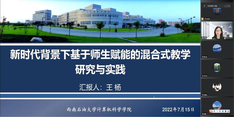 2022年7月15日,公司邀请了西南石油大学计算机科学公司经理、国家首批一流课程负责人王杨教授作题为“新时代背景下基于师生赋能的混合式教学研究与实践”的教学学术报告。报告会由公司副经理张志昌教授主持,公司全体专任教师和职业技术教育专业的硕士研究生在线观看了报告。