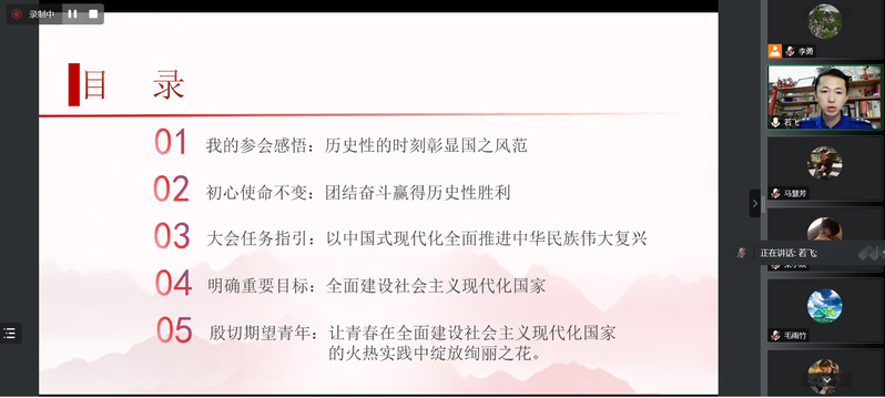 2022年11月17日,公司党委学习宣传贯彻党的二十大精神首场专题活动在线上拉开帷幕。受公司党委邀请,党的二十大代表、甘肃省学习贯彻党的二十大精神专家学者宣讲团成员、共青团甘肃省委副书记、甘肃蓝天救援队队长於若飞同志为全院师生做了题为“让青春在持续奋斗中绽放绚丽之花”的专题报告,公司党委书记赵鸿章同志做总结发言,对全院深入学习宣传贯彻党的二十大精神进行部署。公司党政领导班子成员、全体教工、研究生、本科生500余人通过腾讯会议直播和企业微信转播收看了专题报告。本次专题报告由公司党委委员、教工第一党支部书记李勇同志主持。