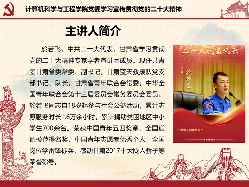 於若飞同志结合自己和甘肃蓝天救援队十年来在社会公益活动中的奋斗历程和发展历程,从参会感悟、初心使命、任务指引、重要目标、殷切期望五个方面展开报告。於若飞以一名大会亲历者的身份,深刻阐述了党在习近平总书记领导下自信自强、守正创新,踔厉奋发、勇毅前行,在全面建设社会主义现代化国家、全面推进中华民族伟大复兴的伟大旅程上取得了辉煌的成就。深刻阐述了只有在中国共产党的正确领导下,广大青年和青年工作者只要脚踏实地、敢想敢为,把对祖国的情感融入到个人事业的追求中,用实际行动践行“请党放心,强国有我”的铮铮誓言,才能让青春在全面建设社会主义现代化国家的火热实践中绽放绚丽之花。
