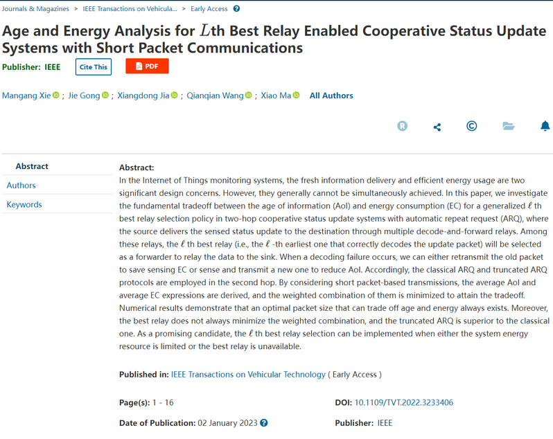 泛在无线通信与物联网团队研究成果在SCI期刊IEEE Transactions o...