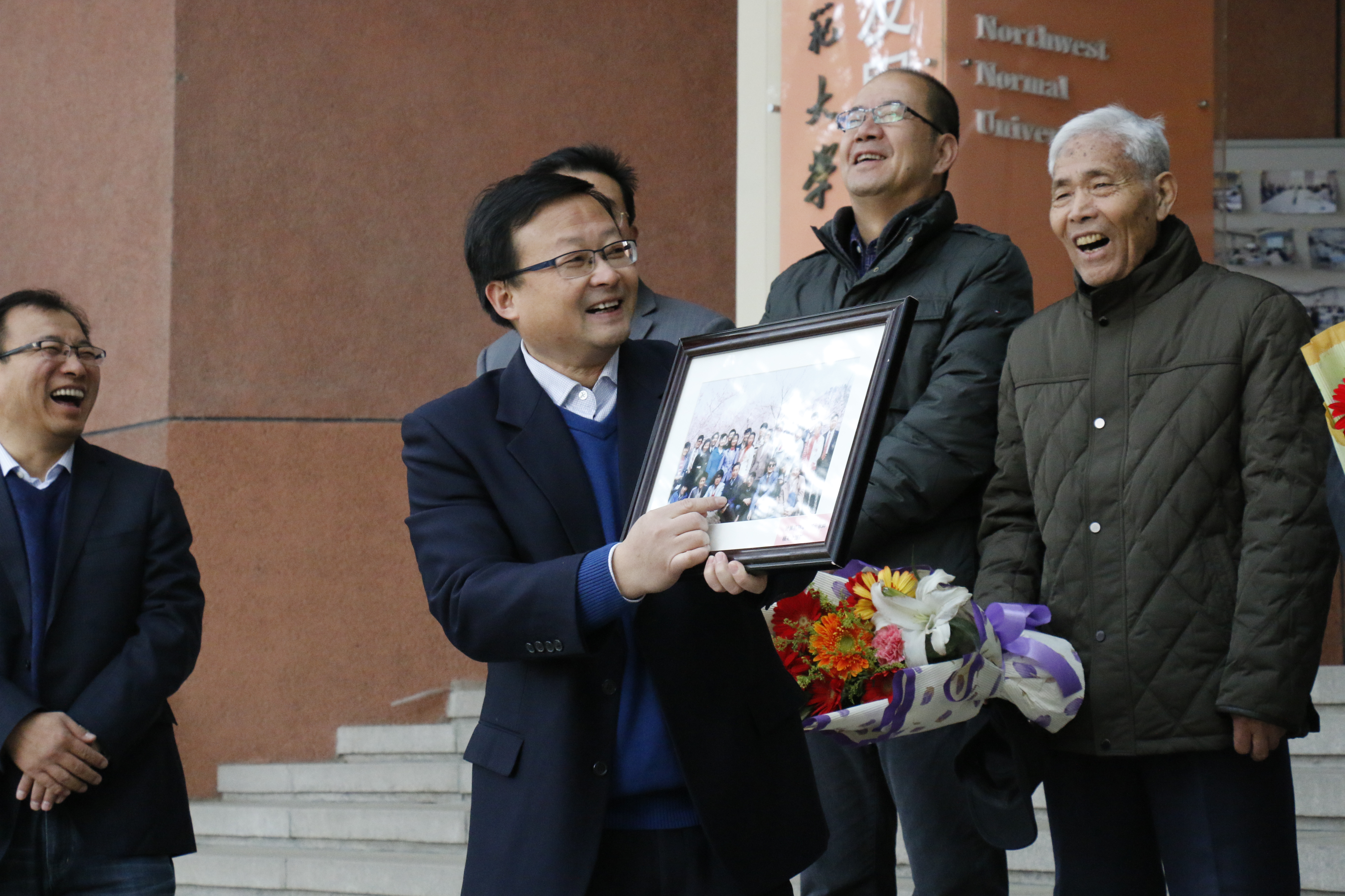 经理党小超介绍老照片的故事书记杨启毅代表公司悬挂了院旗启动仪式上师生合影留念退休教师李运平介绍公司历